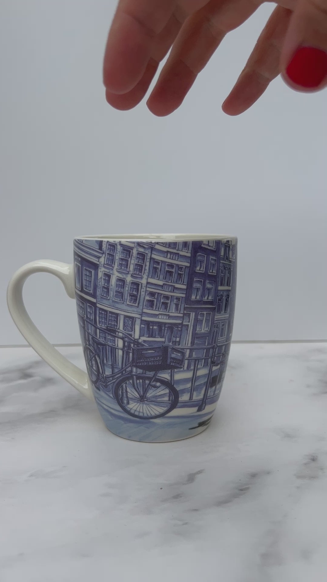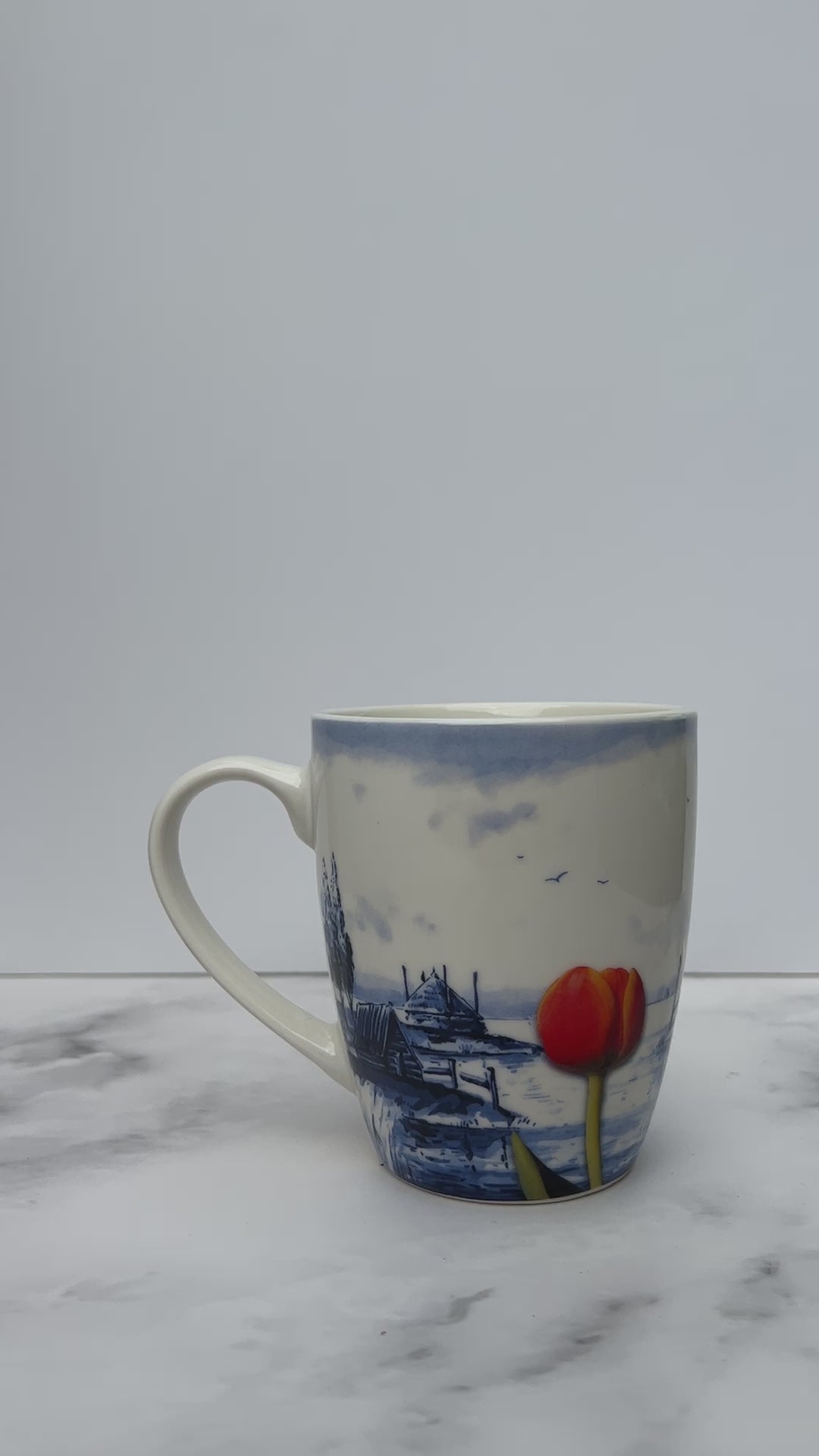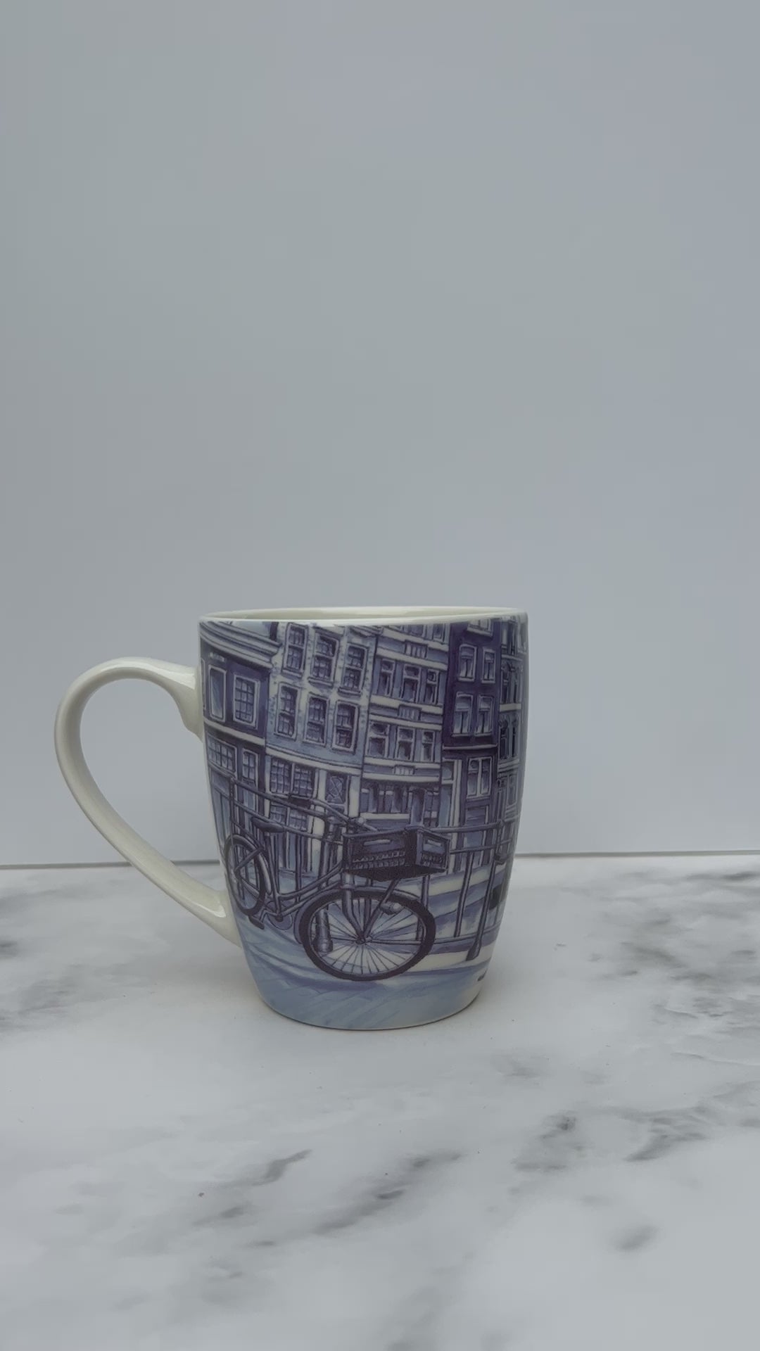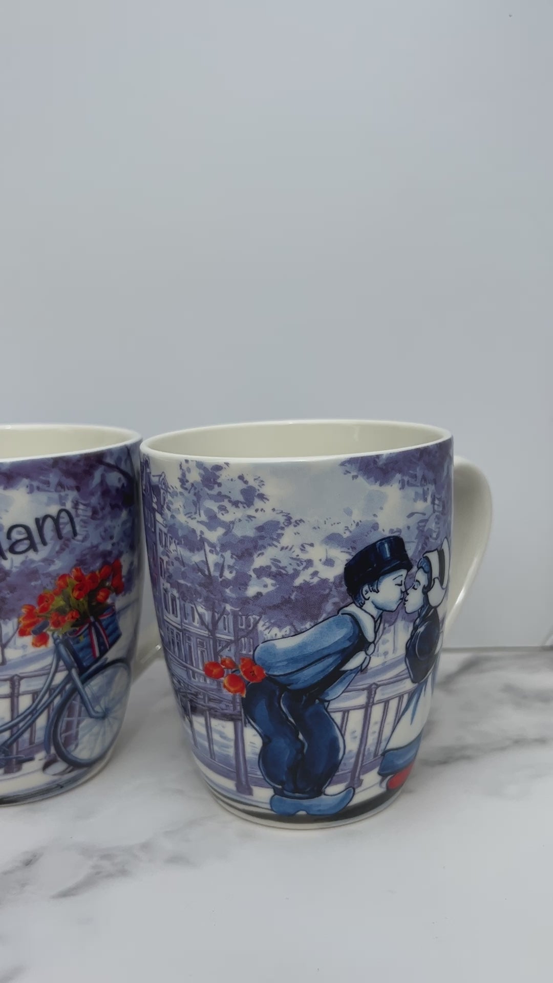 These ceramic mugs adorned with a charming Dutch print, showcasing Dutch wooden Shoes, Tulips, Amsterdam, Canal Houses, Bikes and the famous Kissing Couple against the backdrop of typical Dutch images.
